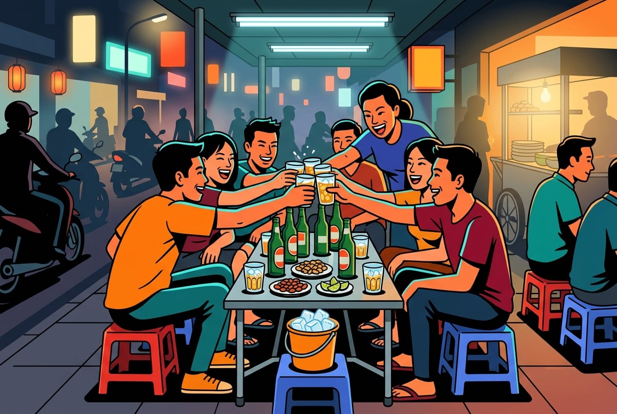Discover the high-energy world of Vietnamese 'Nhậu' culture. Learn why people shout 'Một, Hai, Ba, Dô!', the rules of the 100% toast, and how to survive the sidewalk beer scene.