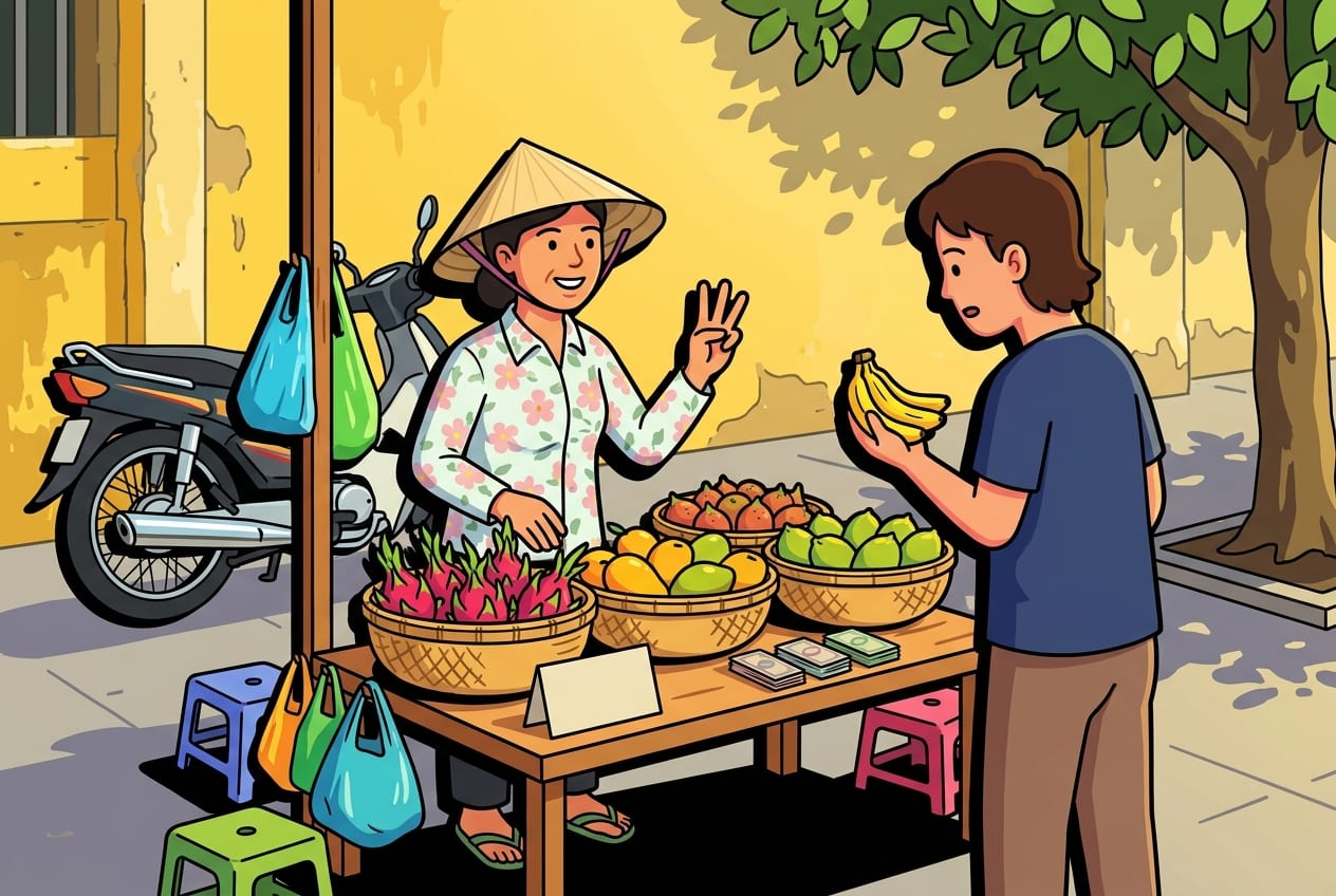 In Vietnam, numbers aren't just for math; they are the heartbeat of the street. When you step into a market, you aren't just buying fruit; you are participating in a rhythmic dance of negotiation and social exchange. The vendor in our scene isn't just telling you the price; she is inviting you into a conversation. If you can respond with 'Ba?' (Three?) or 'Hai?' (Two?), her eyes will light up. It shows you are trying, and in Vietnamese culture, effort is often rewarded with a bigger smile or perhaps an extra banana thrown into your bag for free. Numbers are the bridge between your world and the local life happening on those tiny plastic stools.